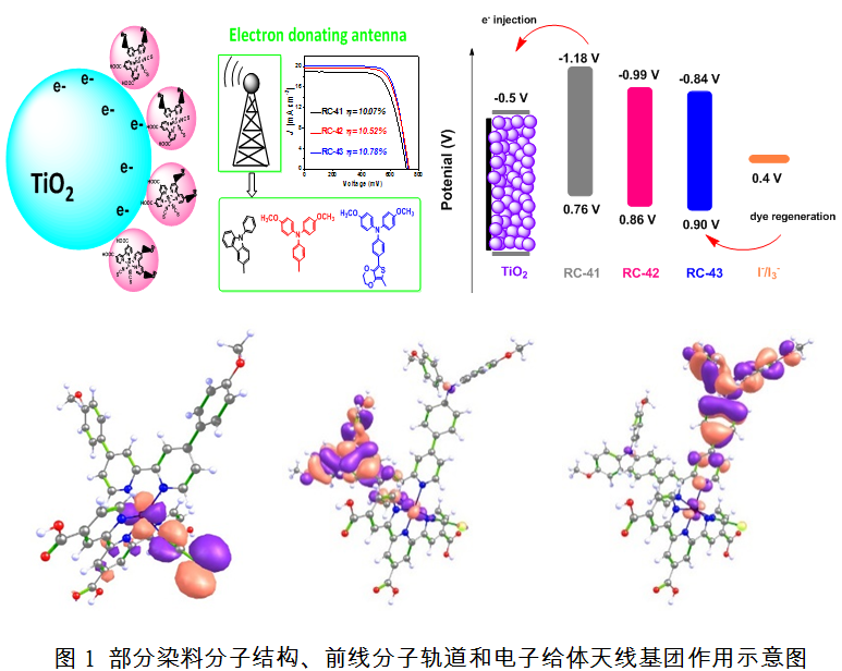钌配合物染料敏化剂是染料敏化太阳电池中应用最早、最广泛的敏化剂。针对传统钌配合物染料敏化剂N3,N719,Z907吸光范围窄,吸光强度弱等缺点,通过在辅助配体上引入含有杂环的电子给体天线基团(苯咔唑,甲氧基三苯胺,EDOT-甲氧基三苯胺等),合成出强吸光宽光谱钌配合物染料敏化剂数十种。将这些染料分子应用在染料敏化太阳电池中,均取得了超过10%的效率,接近国际上钌配合物染料敏化太阳电池的最高水平。图1给出了部分染料分子结构、前线分子轨道和电子给体天线基团作用示意图。
