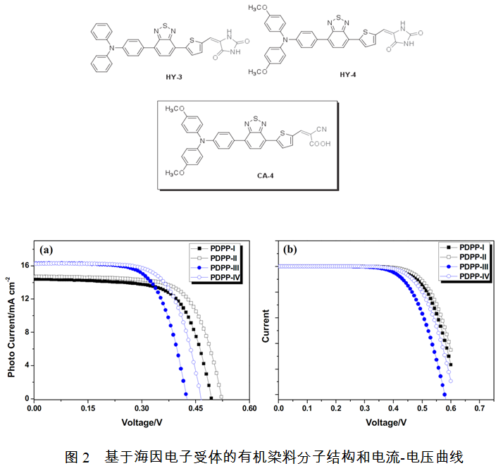 有机染料的结构一般可以由D-π-A来表示,其中D表示给体部分,π表示共轭桥部分,A表示电子受体部分。由于有机染料分子通常是依靠A部分来吸附在二氧化钛表面完成敏化过程,故A一般又可称为锚定基团或吸附基团。目前大多数性能优越的有机染料均使用氰基乙酸来作为锚定基团,针对氰基乙酸易脱附,电子注入效率低等缺点,我们在国际上首次引入海因基团作为有机染料的锚定基团,图2给出了基于海因电子受体的有机染料分子结构和电流-电压曲线。在给体部分和共轭桥部分均使用传统配置(甲氧基三苯胺+噻吩)的情况下,证明了海因基团在吸附稳定性,电子注入效率等方面相较于氰基乙酸均有明显的提高。将含有海因锚定基团的有机染料应用在染料敏化太阳电池中得到了近8%的效率,证明了该类型染料的应用潜力。