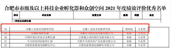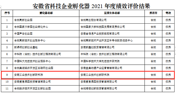 近日,安徽工业技术创新研究院孵化载体在安徽省科技厅、合肥市科技局组织评价的2021年度省级、市级科技企业孵化器绩效考核中荣获双优秀。