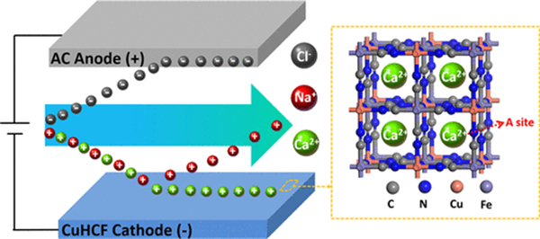 图1. CuHCF基电容去离子技术以及选择性电吸附钙离子示意图。