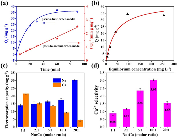 图2.(a)CuHCF电极在1.4V下电吸附钙离子的动力学行为;(b)CuHCF电极在1.4V下钙离子等温吸附曲线;(c)在高钠/钙离子摩尔比溶液中钠和钙离子吸附量;(d)在高钠/钙离子摩尔比溶液中钙离子吸附选择性系数。