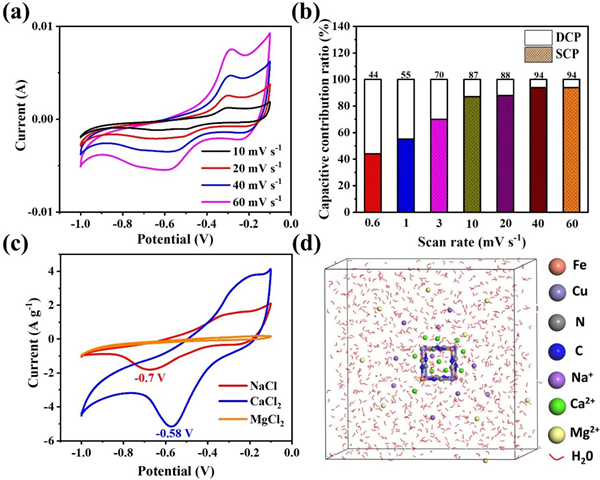 图3. CuHCF电极在1.0 M CaCl2电解液中的(a)循环伏安曲线,(b)在不同扫速下赝电容贡献率,(c)不同电解质溶液中的循环伏安曲线,(d)分子动力学模型示意图。