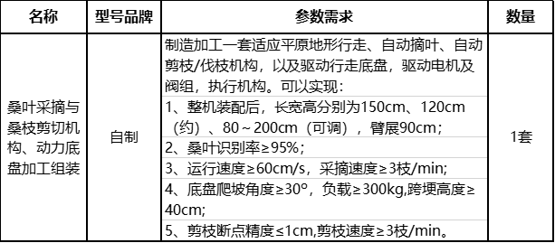 我院因科研需要,拟采购一套桑叶采摘与桑枝剪切机构、动力底盘(包含电机等)加工及组装,通过询价方式,特向有供货能力的合格供应商进行询价,有关具体事项如下: